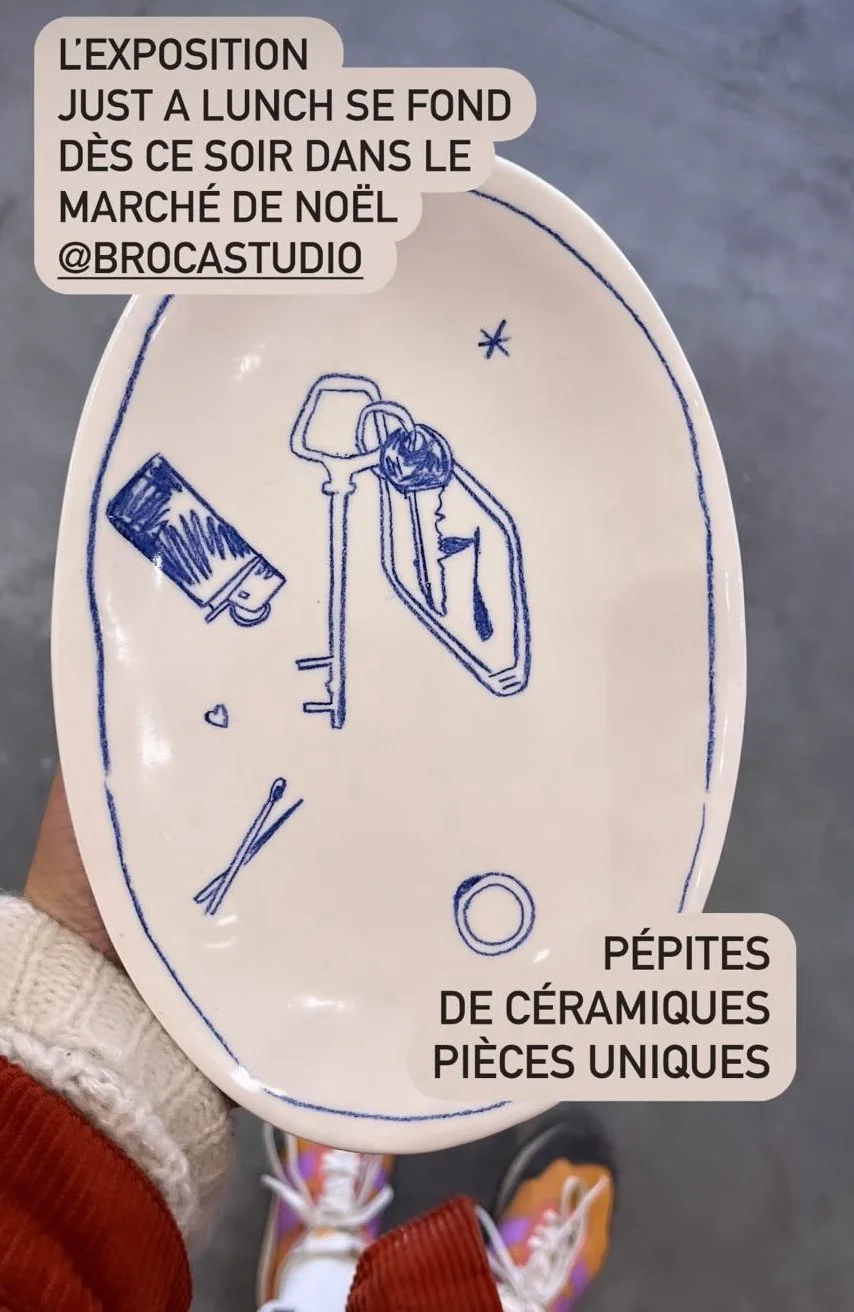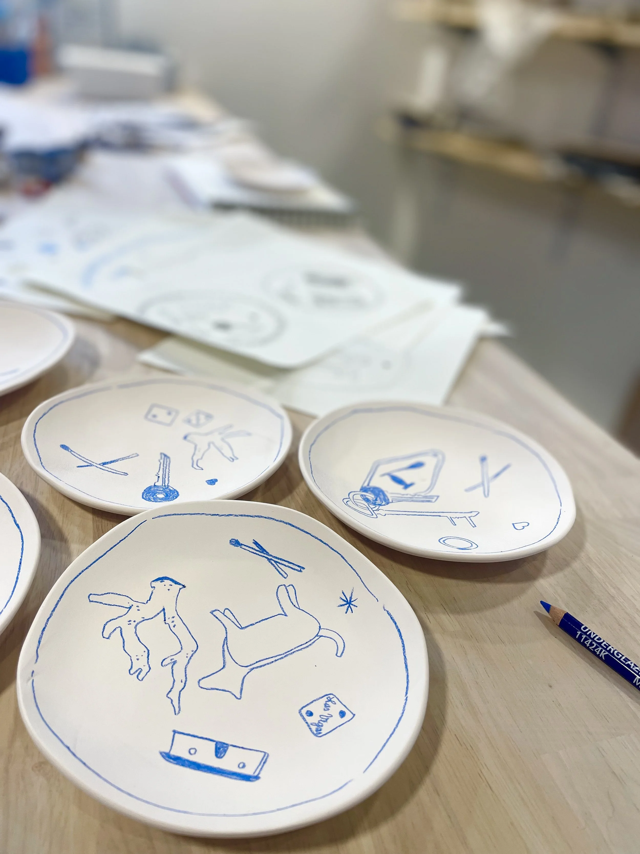 Série de porcelaines - dessins au crayon à oxydes des petits objets qui m’entourent et me portent bonheur pour l’expo Just a Lunch. Commissaire d’expo Anne Charlotte Eriau - 2023 Studio BROCA Sète.